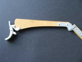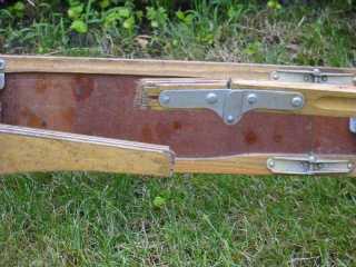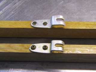 Die hintere Deckleiste war okay, nur der kurze klappbare Teil war gebrochen. Hier konnte ich die Beschläge entfernen und das so freigelegte Sperrholzteil auf ein neues Sperrholzbrett übertragen und aussägen. Nach schleifen, bohren und lackieren konnten die Beschläge wieder angenietet werden.