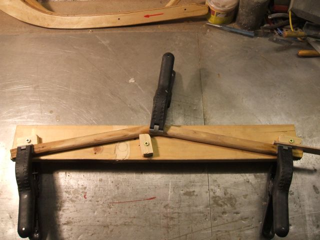 Die filigranen Spanten haben leider grössere Schäden davongetragen. Die Oberseite von Spant 6 ist um 25mm eingesackt. Ich musste den Spant komplett zerlegen. Das Spant-Oberteil habe ich zwei Tage in Wasser eingelegt, und dann mit Hilfe einer Schablone wieder gerade gebogen. Das ging in nassem Zustand ganz einfach. Ich gebe dem ganzen eine Woche zum Durchtrocknen in der Schablone:
