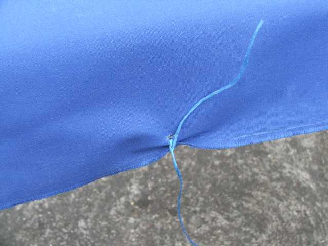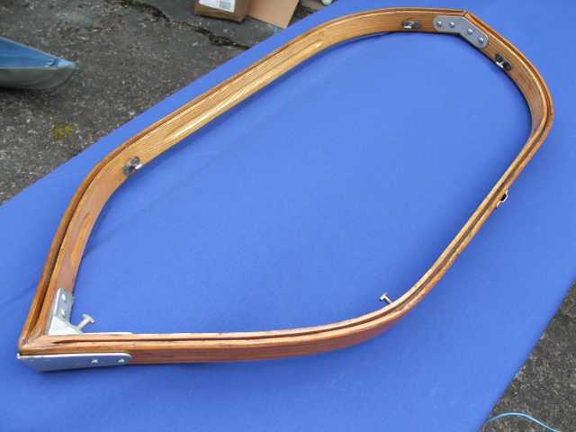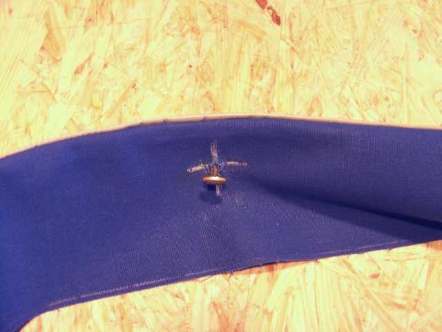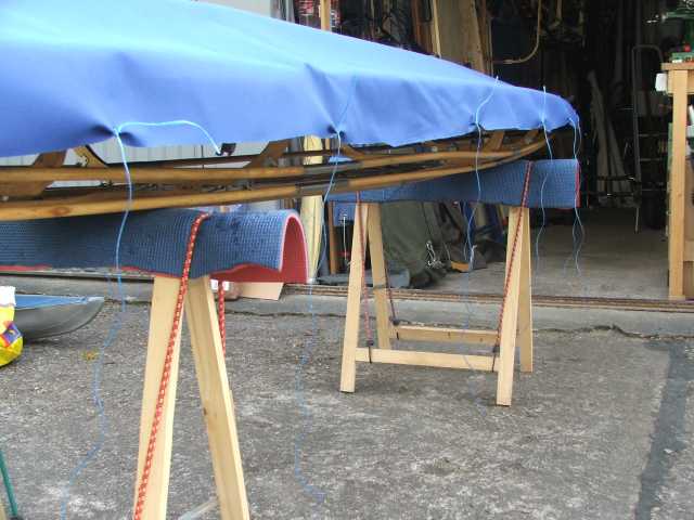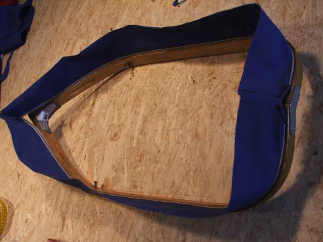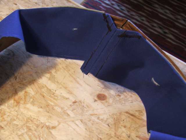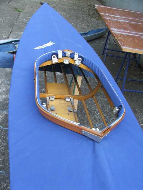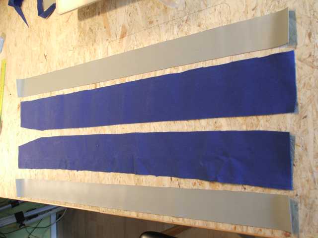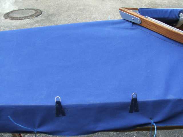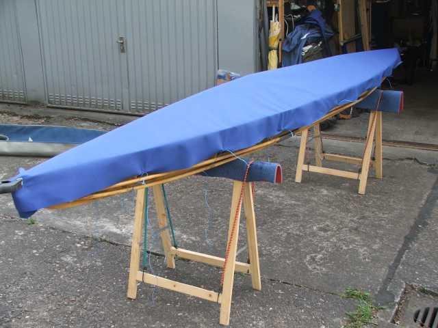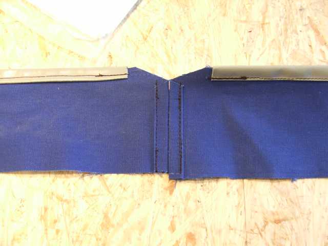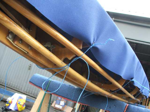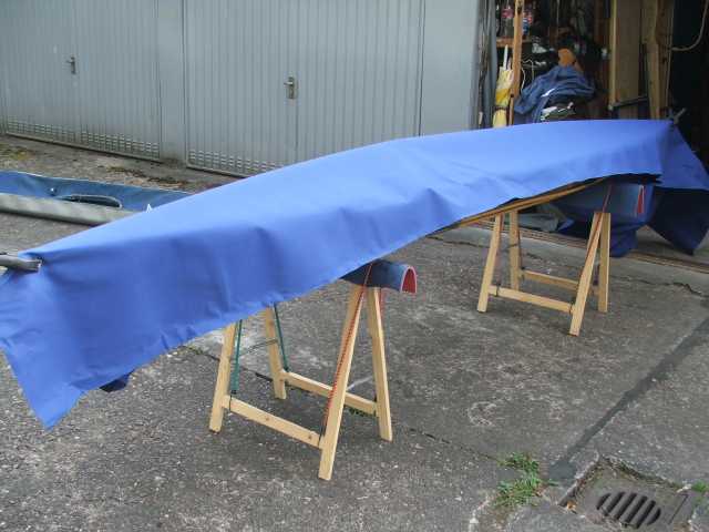 Das Deck wird aus einem einzigen Stoffstück gefertigt. Es handelt sich um Baumwoll-Segeltuch von ca. 400g/qm in Royal Blau. Der mittlere Hauptspant ist nicht montiert.