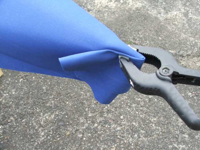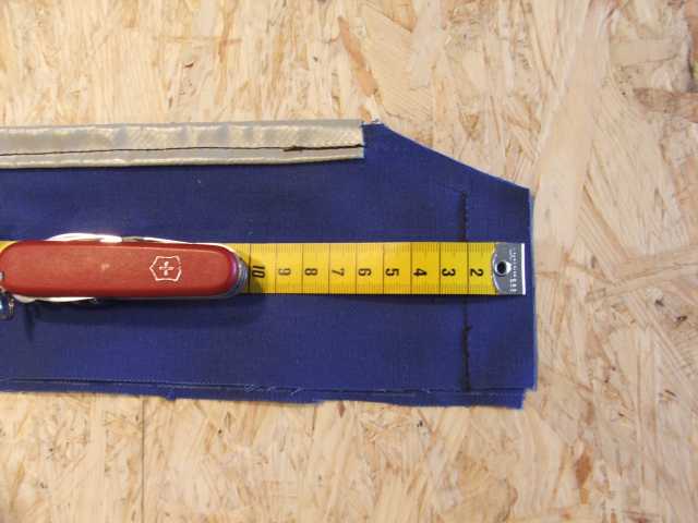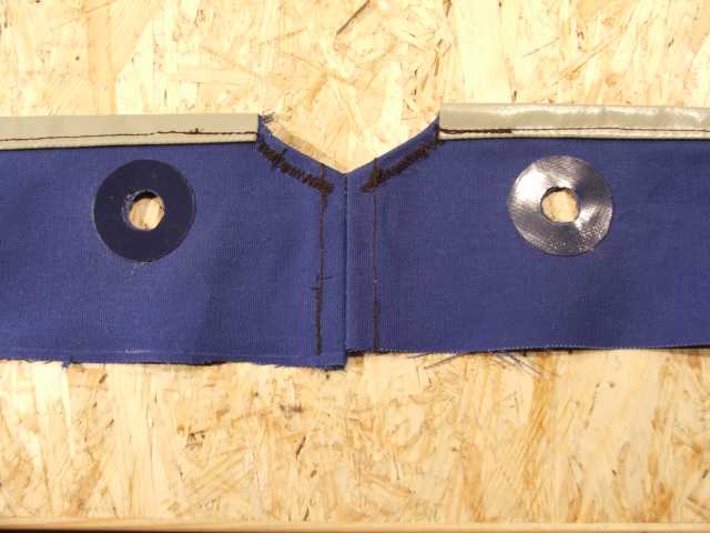 Aus 10cm breiten Streifen Stoff entsteht der Süllrandsaum. Der dicke Rand entsteht aus PVC-Plane, die so oft gefaltet wird, dass er mit eingelegtem Stoff gut in die Süllrandnut passt. In meinem Fall waren das 4 Schichten PVC.