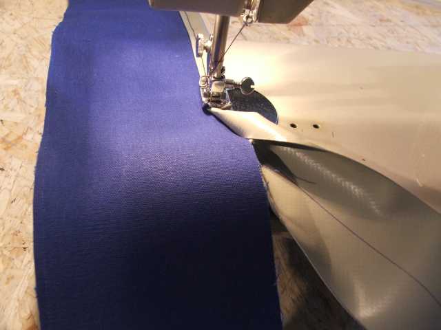 Zuletzt werden 4cm breite PVC-Streifen an der angezeichneten Decksline angenäht. Hier wird später die Unterhaut angeklebt. Die PVC-Streifen vorher anschleifen.