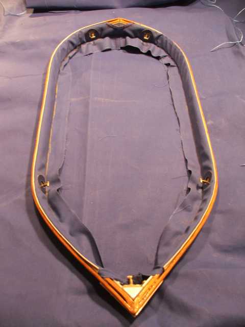 Jetzt wird der Süllrand aufgelegt, genau nach seiner Montageposition am Gerüst, und die Innenkontur auf den Stoff gezeichnet. Der Stoff wird dann zur weiteren Bearbeitung vom Gerüst genommen.