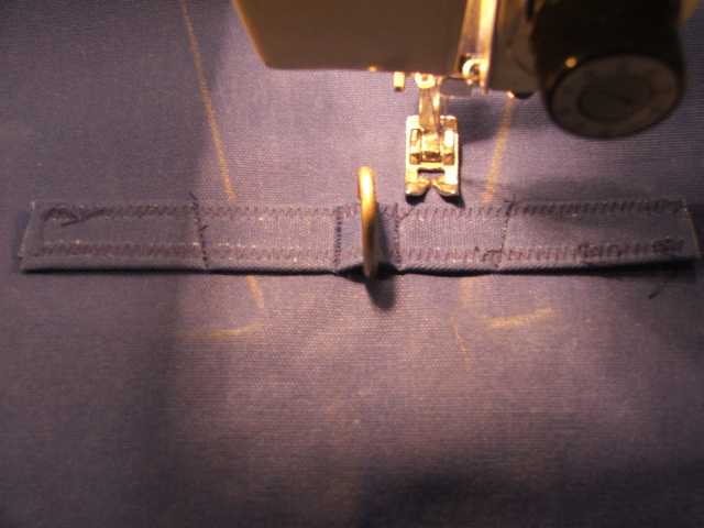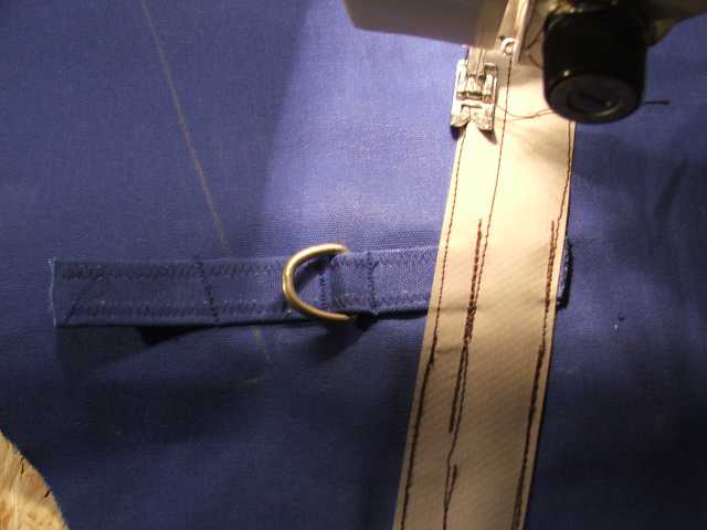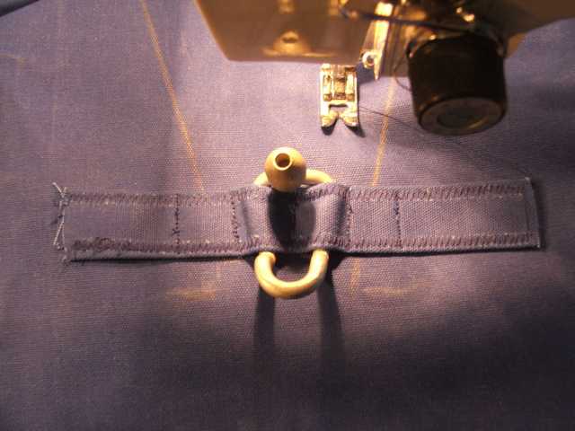 Heckbeschlag-D-Ring von der alten Haut. Der Stoff ist für das Band 3-fach gelegt und per Zickzack-Stich vernäht. Dann kann man das ganze auf den Deckstoff aufnähen.