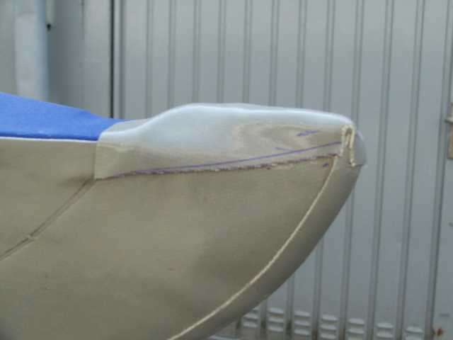 Der vordere Beschlag ist leider zu weit nach vorne geraten und musste entfernt werden. Beim nächsten mal markiere ich mir lieber die Spantenpositionen auf dem Deckstoff, um das besser ausrichten zu können. Die Steven werden nun zuende bearbeitet. Zunächst die Seiten nach oben schliessen. Dann den Abdeckstreifen drüber kleben.