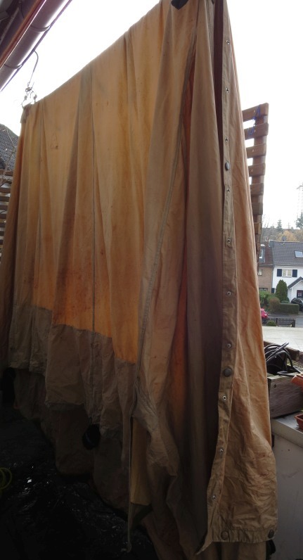 Der Zeltstoff war früher mal deutlich dunkler, man sieht es auf der Innenseite. Nun ist er sandfarben. Ohne Boden, und nachdem das rückwärtige Fenster samt Holz-Fensterrahmen entfernt wurde, konnte der Baumwollstoff nun in der Badewanne gewaschen werden. Ins warme Wasser kam einfach Vollwaschmittel. Die Zeltschnüre wurden solange in alte Socken gestopft und mit Kabelbindern gesichert, damit sich nicht ständig alles verheddert. Nach einem Waschgang und 5 Spülgängen war das Wasser immernoch schwarz, es musste dann einfach auch mal gut sein. Die Duftnote wurde jedenfalls schon besser. Danach hing das Zelt zum trocknen auf dem Balkon. Die Stockflecken sind natürlich nicht raus gegangen, mehr Aufwand stecke ich da auch nicht rein, und mit scharfen Mitteln will ich da nicht ran. Vielleicht kann es die Sonne später bleichen.