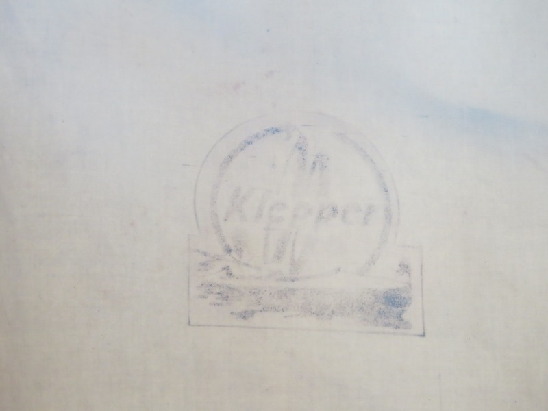 Hier sieht man gerade noch das Klepper-Logo. Es gibt eins auf jeder Schrägseite. Der untere Teil des Logos stellt ein Faltboot dar. Rechts der Bug mit Wimpel, links der Paddler mit Paddel.