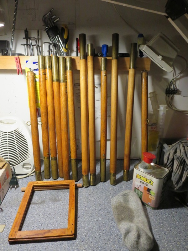 Die (senkrecht stehenden) Zeltstangen konnten einfach mit Hartöl ein wenig aufgefrischt werden (kein Anschleifen nötig, einfach mit einer alten Socke eingerieben). Sie sind dann besser vor Witterung geschützt, ohne allzuviel von ihrer Patina einzubüßen. Einige Hülsen sind sehr locker. Deshalb habe ich diese Stangenenden in Wasser gebadet. Das Holz quillt auf und die Hülsen sitzen wieder fest. Das hält aber nicht lange vor.