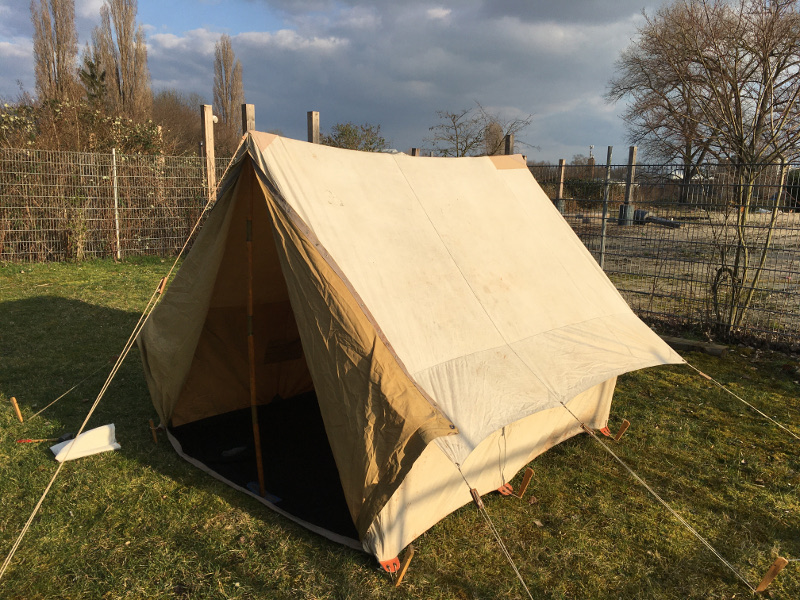 Passend zum Vorkriegs-Faltboot wird natürlich auch ein Zelt benötigt. Ich bekam dieses Klepperzelt aus den 1930ern. Die damals übliche Hauszeltgröße ist für ein Standlager gerade richtig. Damals kam eine ganze Familie darin unter. Heute muss es nicht mehr so beengt zugehen: