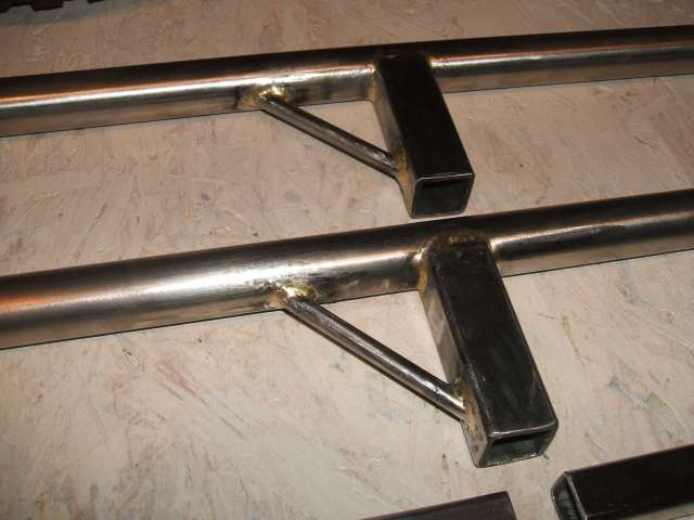 3. Obere Längsholme, Rundrohr D20x1,5, 450 lang. Mittig sind je ein Vierkantrohr 20x20x2, 60 lang angelötet, siehe nächstes Bild.