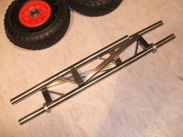 (entweder einfach Räder abnehmen und auf der Achse balancieren, oder ich baue noch 'Stuhlfüsse'), und mit entsprechender Deichsel als
