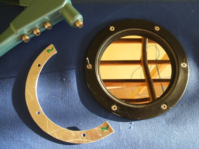 Die Einzelteile: Halbringe aus 2mm Alublech (ist materialsparender als Vollringe), 4mm Popnieten und die Luke. Der Rest auf dem Bild gehört nicht hierher.