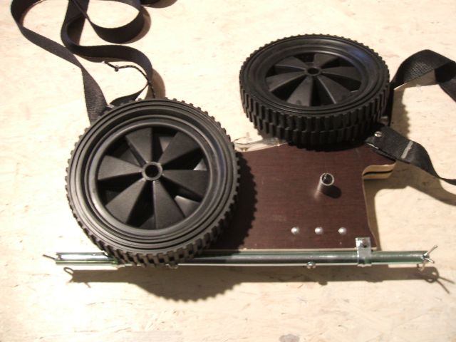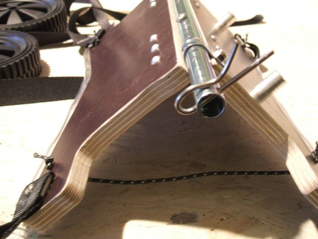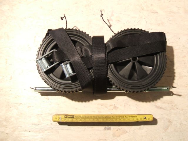 Dabei werden die Räder auf Zapfen aus geschlitztem Alurohr aufgesetzt. So bleibt das alles eine Einheit. Die Räder und das 12mm Achsrohr sind aus dem Baumarkt für wenige Euro.