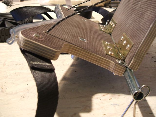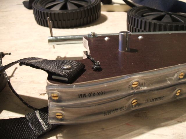 Die Gurtenden sind mit einem Stück Alublech versehen und angeschraubt. Das Holz ist 12mm Siebdruckplatte und ohne weitere Lackierung wasserfest (ich habe das ausprobiert). Zur Polsterung sind PVC-Schläuche mit Messingschrauben aufgeschraubt.
