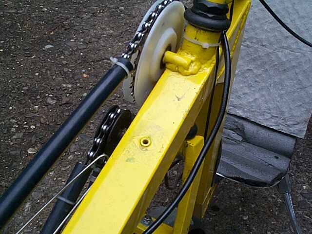 Die Kugellager sind eingepresst. Der Platz zwischen den beiden Lagern, ca. 1,7mm, ist mit einem Ring aus Rohr 12x1 ausgefüllt. Dadurch kann Karsten den Aufnahmebolzen fest anziehen, ohne dass die Lager klemmen. Das Ritzel ist ebenfalls fest aufgepresst. Lager und Ritzel sind zusammen an einem Polyamidkörper befestigt. Die Polyamidscheibe auf der anderen Seite dient nur der zusätzlichen Abstützung, bildet die Kettenabdeckung und ist mit drei Schrauben befestigt.