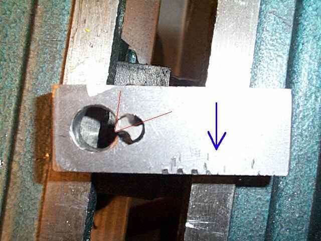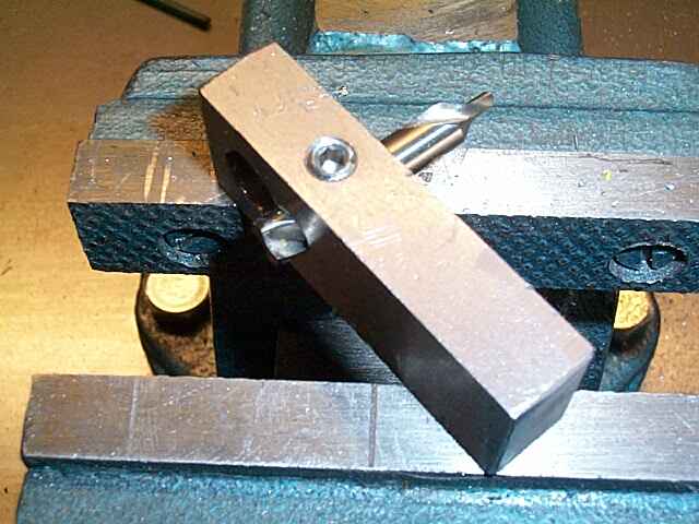 Das Werkzeug besteht aus einem Stück Flachstahl mit einer Bohrung von 10mm Durchmesser. Direkt neben der Bohrung ist eine zweite Bohrung von 6mm, in der ein abgeschliffener Zentrierbohrer steckt. Der erfüllt die Aufgabe des Drehstahls und wird durch eine Madenschraube seitlich gehalten.