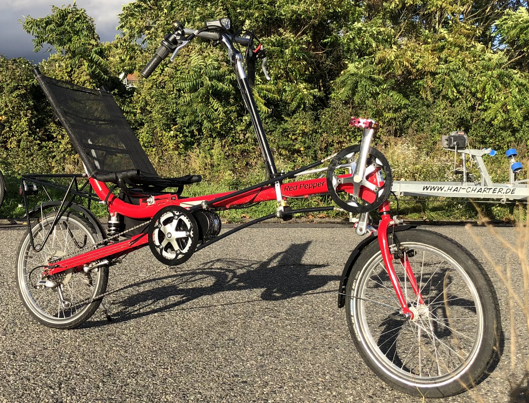 Jetzt ist es passiert: Ich habe tatsächlich zum ersten Mal ein Serien-Liegerad gekauft. Es handelt sich um ein Red Pepper von Radius, und dürfte gut 25 Jahre alt sein. Hinten gefedert, vorne nicht, SRAM 3x7 im Hinterrad, Sitz mit "Schüttelbrett" (weil man hart drauf sitzt), Obenlenker, alte Cantibremsen. Bei einer kleinen Proberunde ums Haus kam ich gleich sehr gut damit zurecht, als wäre ich nie was anderes gefahren. Erleichterung. Ein Eigenbau wäre weder besser noch billiger geworden, das Rad hat nur 150 Euro gekostet.