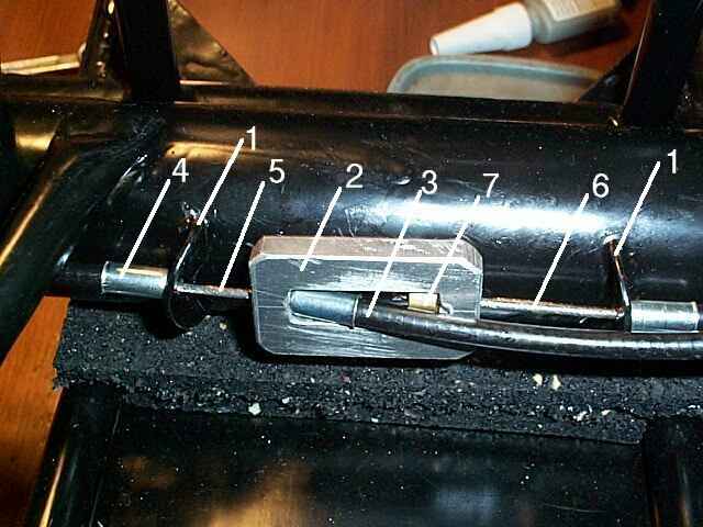 Jetzt lüfte ich das Geheimnis um das Bremskraftdifferential: Zwischen den beiden Blechen (1) sitzt das Differential (2). Es ist aus einem Stück 6mm Alublech gefertigt. Wo die Bowdenzüge (5) und (6) durchgehen befindet sich jeweils eine Bohrung.