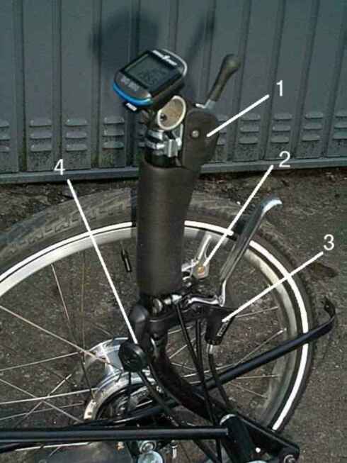 So muss das sein: Der mit Armaturen vollgepackte linke Lenkhebel: (1) ist der 3-Gang Schalthebel. Ich verwende diesen lieber als den Drehgriff, er ist viel leichtgängiger. Den kleinen Hebel (2) habe ich aus 6mm Alublech selbst gebastelt. Mit ihm kann ich die Radlaufglocke bequem mit dem kleinen Finger bedienen. Der Originalhebel war mir zu primitiv. (3) ist der Griff der Hinterradbremse, mit (4) schalte ich den Dynamo ein.