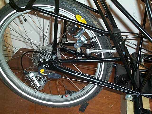 Genauso vollgepackt: Der Hinterbau. Neben 3- und 7-Gang -Bowdenzug sind da noch Radlaufklingel, Bremse und Dynamo per Bowdenzug angesteuert. Vom Dynamo führen ausserdem noch die zwei Kabel weg für Front- und Rücklicht.