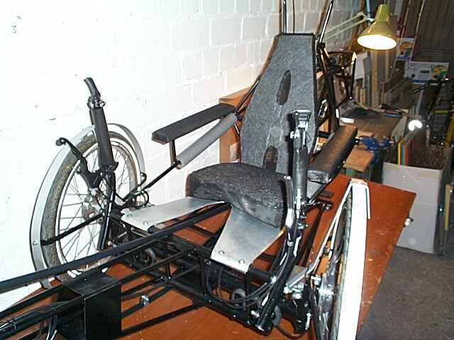 Der 'Pilotensitz' :-) Das Rückenpolster besteht aus einer speziellen Böschungsmatte. Diese gibt es bei Pedalkraft speziell als Liegeradpolsterung zu kaufen. Sie ist sehr luftdurchlässig und verhindert so, dass man am Rücken schwitzt. Die Böschungsmatte hat beidseitig ein Flies, dazwischen befindet sich ein grobes Gewebe aus Kunststofffäden. Ich habe einen Bezug aus Netzmaterial drumrum genäht, das normalerweise zum Bespannen von Spannsitzen verwendet wird.