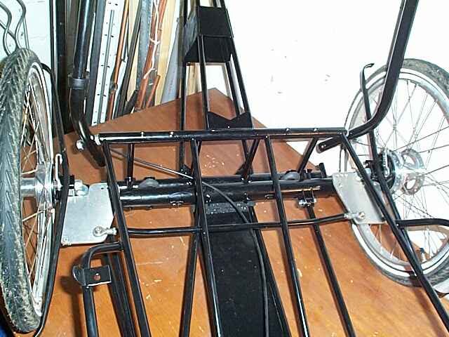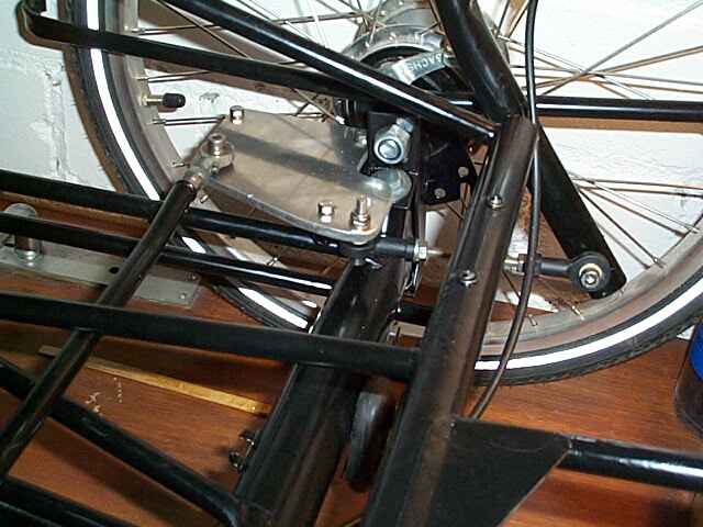 Nachteil dieser Konstruktion ist, dass der Stellweg der Bowdenzüge halbiert wird. Deshalb habe ich auch den grossen Motorrad-Handbremsgriff verwendet. Dieser hat einen grösseren Stellweg als ein Fahrrad-Handbremsgriff. Trotzdem lässt sich der Bremshebel bis zum Lenkhebel durchziehen. Die Bremswirkung ist bescheiden. Mal sehen, ob ich da noch eine Verbesserung machen kann.