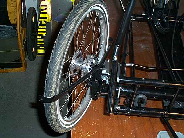 Hier sieht man auch, wie die Radverkleidungsträger, die an den Achschenkeln noch dazu gekommen sind, um das Rad herumgreifen.