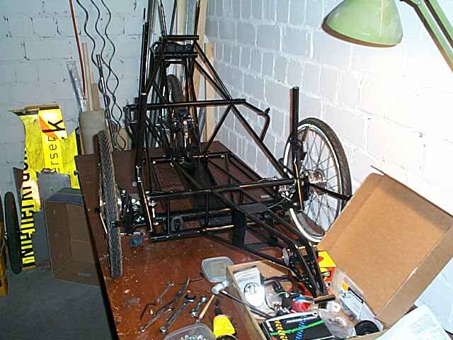 Hier ist der Hauptrahmen mit eingebauter Achse. Das Zeug in dem Karton muss alles noch dran, noch mehr Zeug liegt noch in den Regalen rum.