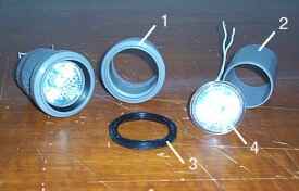Hier sind die Akkulampen. Sie bestehen aus Halogenspot-Reflektorlampen mit 50mm Durchmesser. Das Gehäuse habe ich aus 50er Kunststoffrohren gefertigt: Das Teil 1 ist das dickere Ende, wo ein weiteres Rohr reingesteckt werden kann. Es wird erst hinter dem Bereich, wo sich das Rohr verjüngt, abgeschnitten. Dann wird der Innendurchmesser so abgeschliffen, dass das Teil 2 da sehr stramm von hinten hineinpasst. Das Teil 2 besteht aus dem dünnen Ende des Rohres. Wenn nun die Dichtung 3 wieder eingesetzt ist wird die Lampe 4 eingelegt und das Rohr 2 eingeschoben. Nur durch das Rohr 2 wird die Lampe 4 gut zentriert und festgehalten.