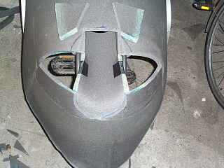 Und so siehts inzwischen aus, einigermassen schlank. Man kann schon den Übergang zwischen Frontscheibe und Seitenscheiben erkennen. Die Frontscheibe habe ich weiter als geplant nach vorne gesetzt. Sie beginnt schon vor den Knien, dadurch bleibt mehr Bewegungsfreiheit.
