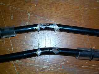 Dies sind die Achsschenkel mit den Radverkleidungsträgern aus 12x1er Rohr, wie ich sie zuletzt gebaut habe. Der Radverkleidungsträger auf der linken Seite ist abgebrochen. Ausschlaggebend dafür dürfte sein, dass ich zur Demonstration mehrmals die Radverkleidung abgenommen habe. Die sitzt sehr stramm und beim wiederaufsetzten hats wohl mal geknakst.