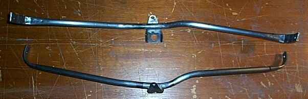 Die sehr geschwungene Form vergrössert den Radeinschlagwinkel. Bei den alten Radverkleidungsträgern ist nämlich immer die Lenkhebel-Befestigungsschraube angeschlagen und hat den Einschlagwinkel eingeschränkt (siehe Pfeile).