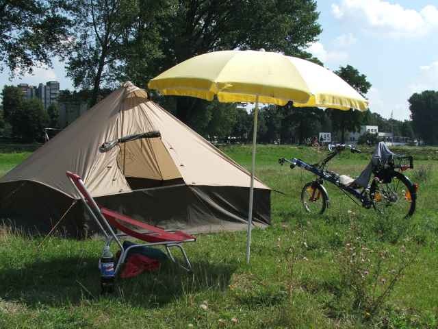 Dieses Zelt habe ich UMME genannt, weil es sozusagen 'für umme' war. Das ist Kölner Dialekt und heisst 'für umsonst'. Ich habe es nämlich aus Restmaterial gebaut, das sich bei mir angesammelt hatte und einer sinnvollen Verwendung zugeführt werden sollte.
