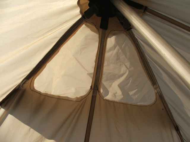 Die Zeltspitze ist mit Gurten verstärkt, von innen mit einem Stück PVC-Gewebeplane verschlossen und von aussen mit einem Stück Dachmaterial abgedeckt. Ausserdem ist hier noch eine grosse Lüftungsöffnung eingebaut, die mit Moskitonetz verschlossen ist.