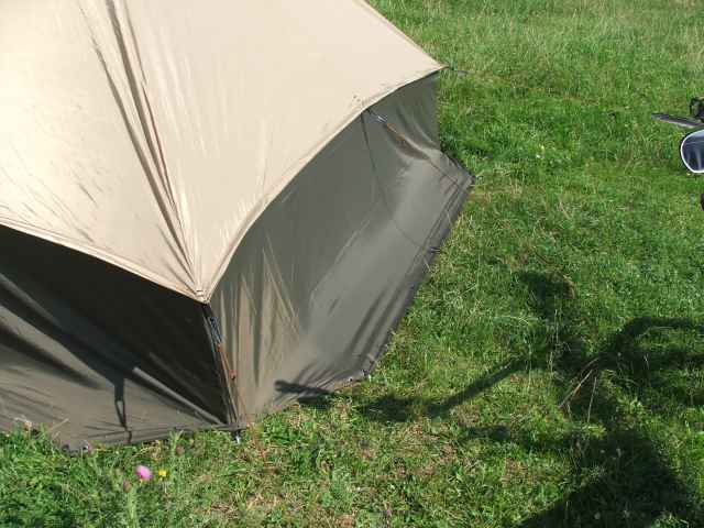 Die Zeltwände bestehen aus Zeltplane aus ehemaligen Beständen des österreichischen Heeres. Sie bestehen aus beschichtetem Nylon und ich habe sie mal billig bei Gelegenheit bekommen. Seit dem lagen sie rum und mussten auch mal weg. Die Form der Unterkante ist mehr zufällig aus der vorhandenen Unterlante entstanden. Sie schliesst schön am Boden an und lenkt den Wind weg. Im Winter könnte man hier Schnee drauf schaufeln. Bisher war ich aber noch nie im Winter auf Camping... :-)