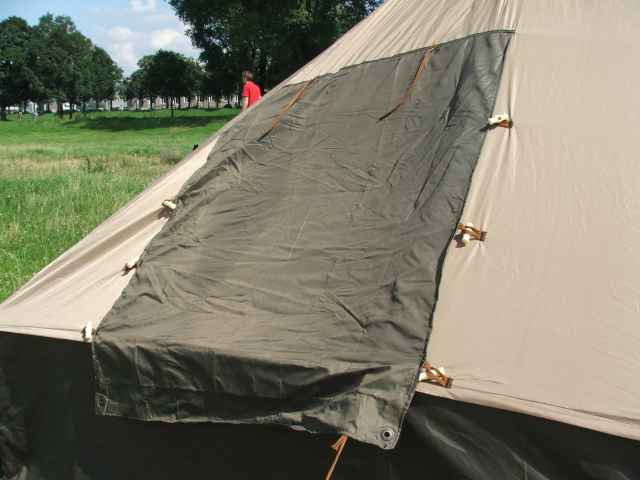 Die Tür ist aus dem gleichen Material. Sie wird seitlich mit Knebeln verschlossen, kann hochgerollt und fixiert werden oder mit Stöcken und Schnüren abgespannt werden um eine Apside zu bilden.