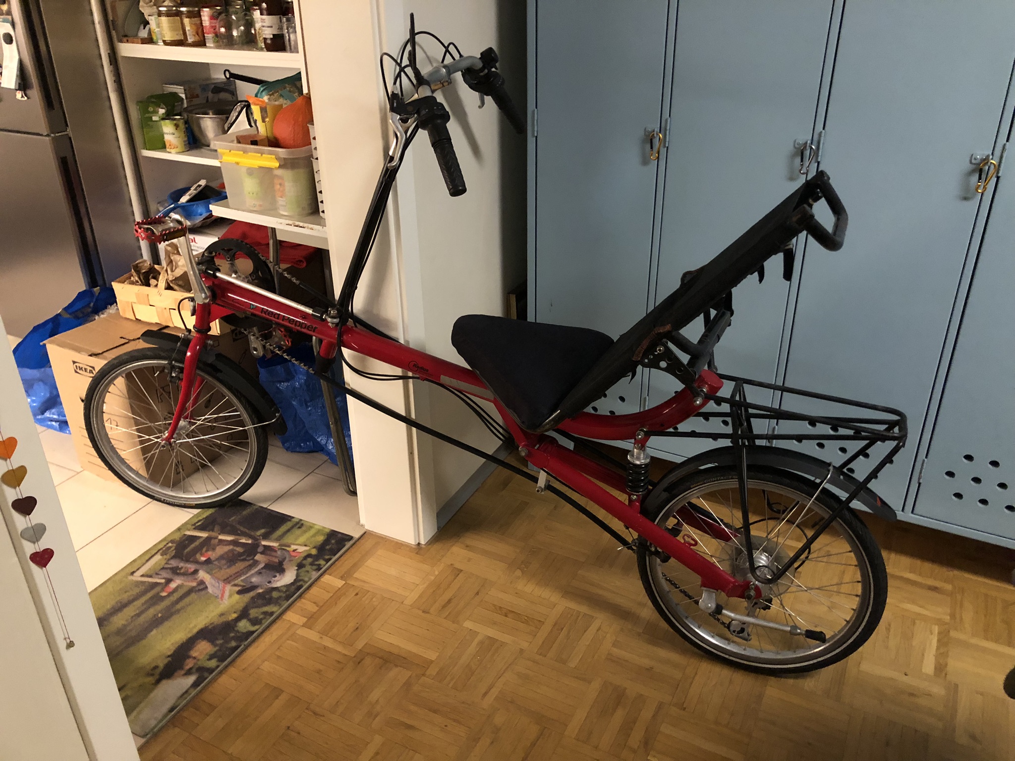 Jetzt ist es passiert: Ich habe tatsächlich zum ersten Mal ein Serien-Liegerad gekauft. Es handelt sich um ein Red Pepper von Radius, und dürfte gut 25 Jahre alt sein. Hinten gefedert, vorne nicht, SRAM 3x7 im Hinterrad, Sitz mit "Schüttelbrett" (weil man hart drauf sitzt), Obenlenker, alte Cantibremsen. Bei einer kleinen Proberunde ums Haus kam ich gleich sehr gut damit zurecht, als wäre ich nie was anderes gefahren. Erleichterung. Ein Eigenbau wäre weder besser noch billiger geworden, das Rad hat nur 150 Euro gekostet.