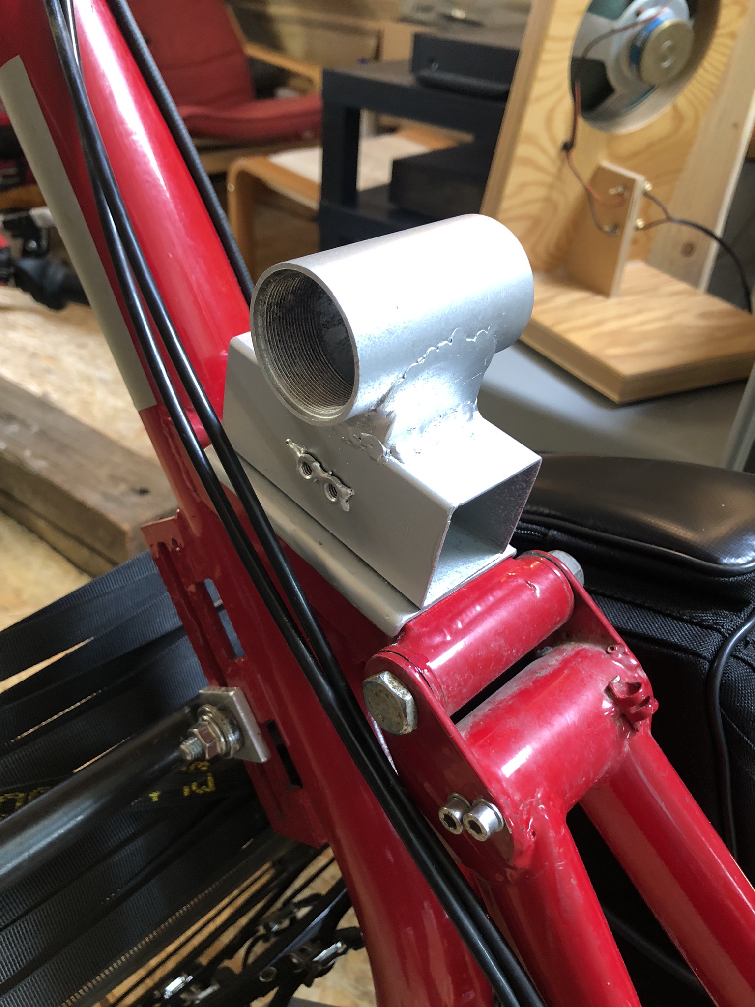Diese Tretlagerhülse konnte aus einem alten Rahmenteil eines alten Liegeradprojektes gewonnen und mit Anpassungen unter den Rahmen geschraubt werden. Ansicht von unten.
